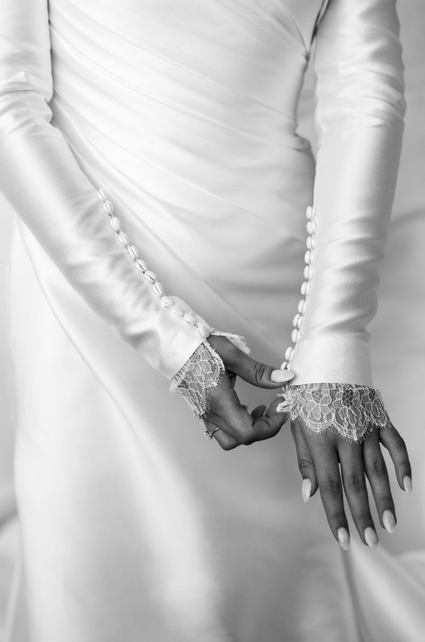 The gown’s versatility is further enhanced by its detachable sleeves, offering the bride a unique opportunity to transform her look throughout the day. When worn, the sleeves create a graceful, elongated silhouette, with the fabric gently hugging the arms and flowing down to the wrists.