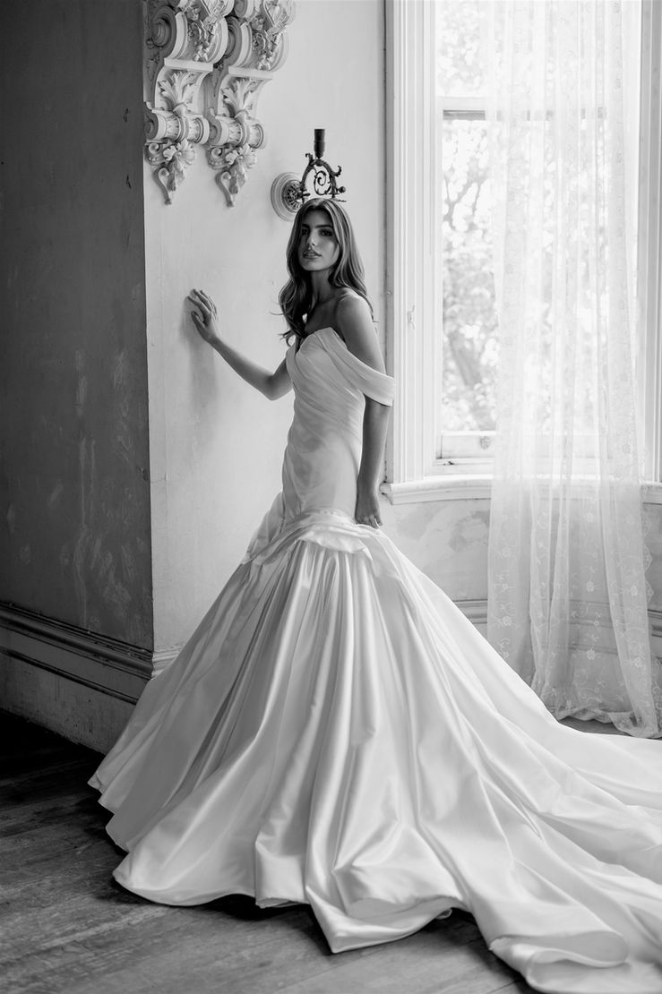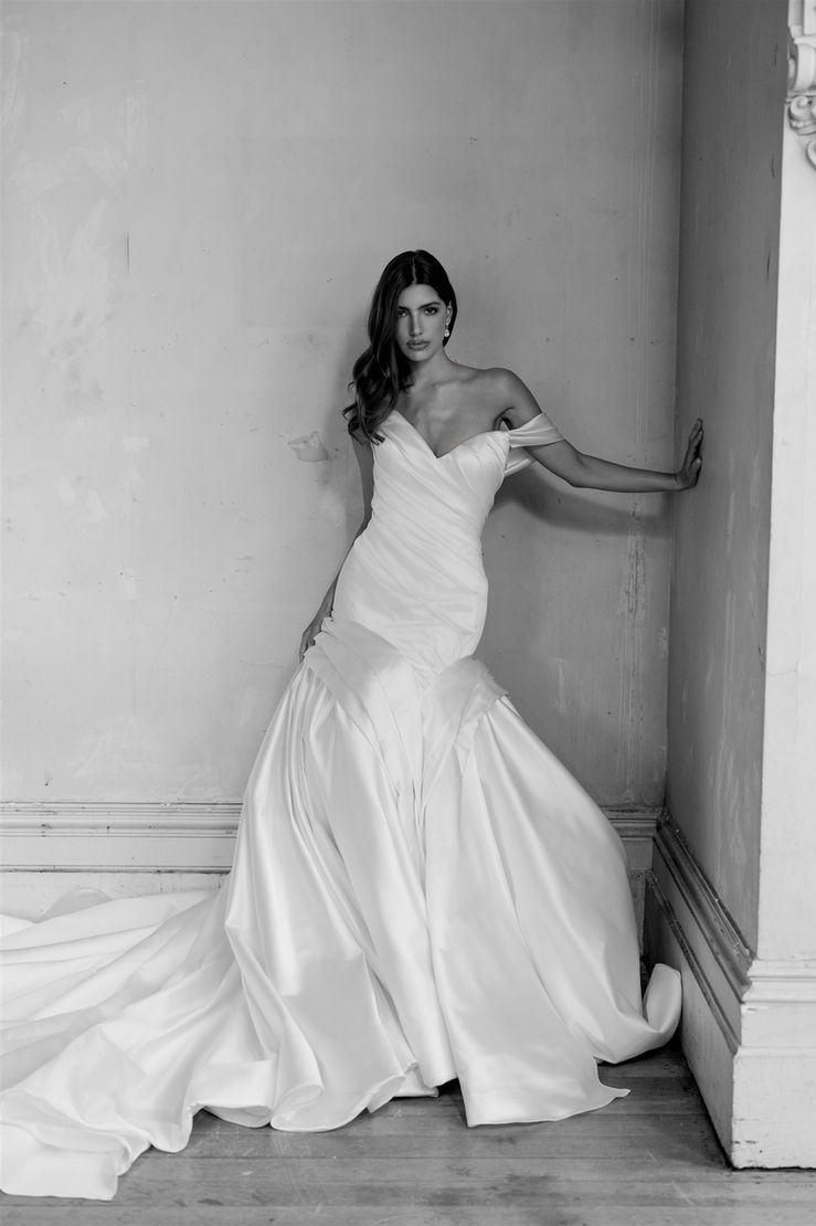 A study in sculptural grandeur, Harlow is crafted from sumptuous Duchess silk and features an off-the-shoulder design with a dramatic asymmetrical dropped-waist corset.